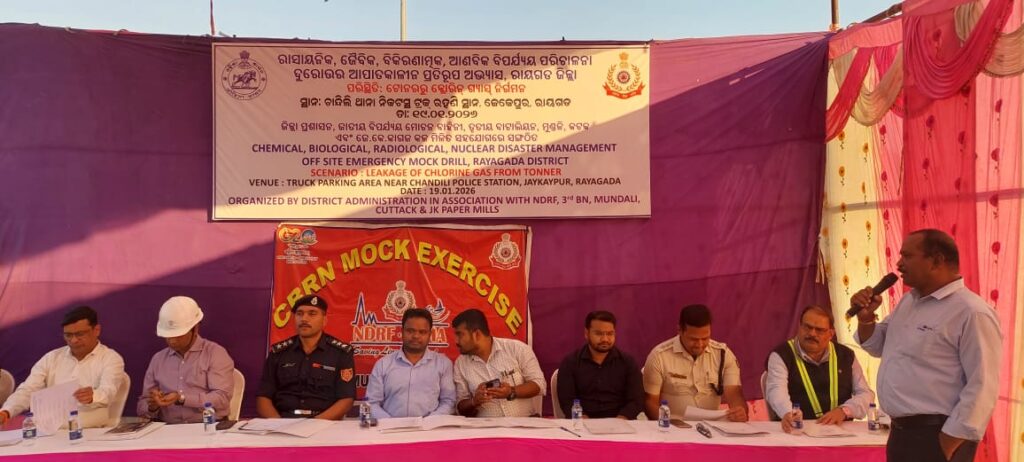 ରାୟଗଡ଼ା:୧୯/୦୧/୨୬-ରାୟଗଡ଼ା ଜିଲ୍ଲା ପ୍ରଶାସନଙ୍କ ନେତୃତ୍ୱରେ ଏବଂ ଏନଡିଆରଏଫ ୩ୟ ବ୍ୟାଟାଲିୟନ୍, ମୁଣ୍ଡଳୀ (କଟକ) ଓ ଜେକେ ପେପର ମିଲ୍ସର ସହଯୋଗରେ ଆଜି ଚାନ୍ଦିଲି ଥାନା ସମୀପସ୍ଥ ଟ୍ରକ୍ ପାର୍କିଂ ଏରିଆରେ ରାସାୟନିକ, ଜୀବୈଜ୍ଞାନିକ, ବିକିରଣ ଓ ପରମାଣବିକ ବିପର୍ଯ୍ୟୟ ପରିଚାଳନା ସମ୍ବନ୍ଧୀୟ ଏକ ଅଫ୍-ସାଇଟ୍ ଏମର୍ଜେନ୍ସି ମକ୍ ଡ୍ରିଲ୍ ସଫଳତାର ସହିତ ଅନୁଷ୍ଠିତ ହୋଇଛି।